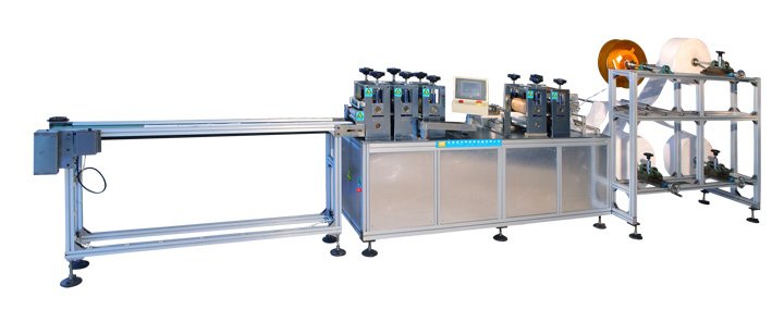 This machine produces non-woven face mask body automatically from raw material to finished mask body.